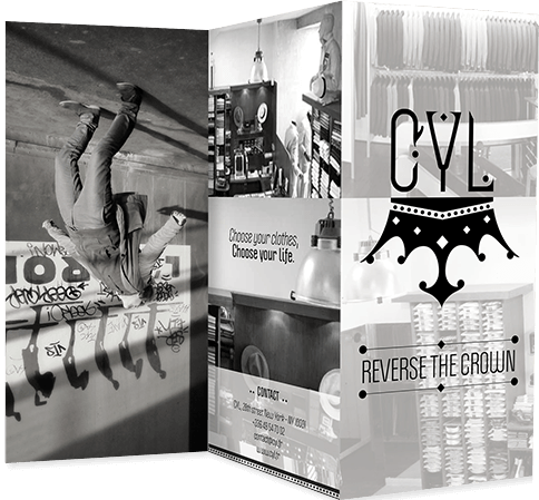 Choose Your Life (CYL) is a fictional streetwear clothing brand such as G-Star RAW or RG 512. Its identity, based around the reversed crown, is a state of mind for the consumers, who show their opposition to the fashion standards and go against the established rules. The baseline "REVERSE THE CROWN" illustrates well this idea to appropriate the brand, to be part of its values.